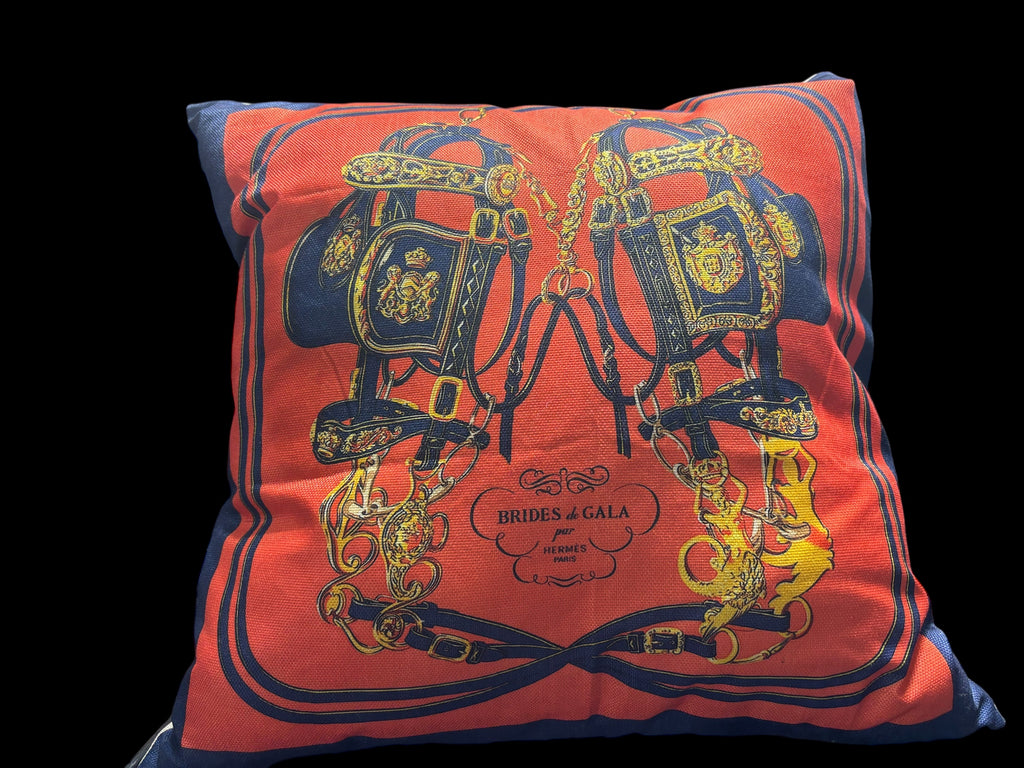A stunning large pillow in a canvas material with antique bridles in navy and orange. Zipper for easy access to remove filler. Size 20x20
