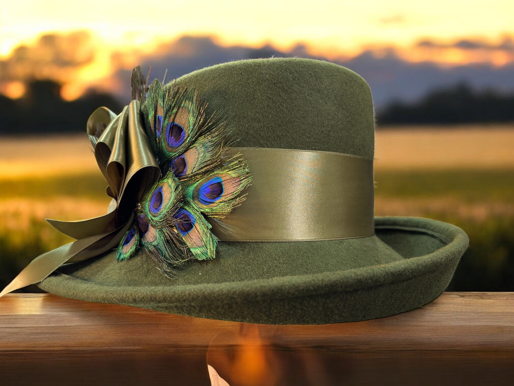 A fabulous new shape in linen green with a. asymmetrical brim flat crown, trimned with matching satin ribbon and stunning peacock feathers across the front an d side.So easy to wear. Size M