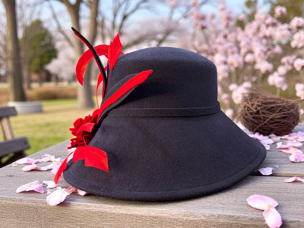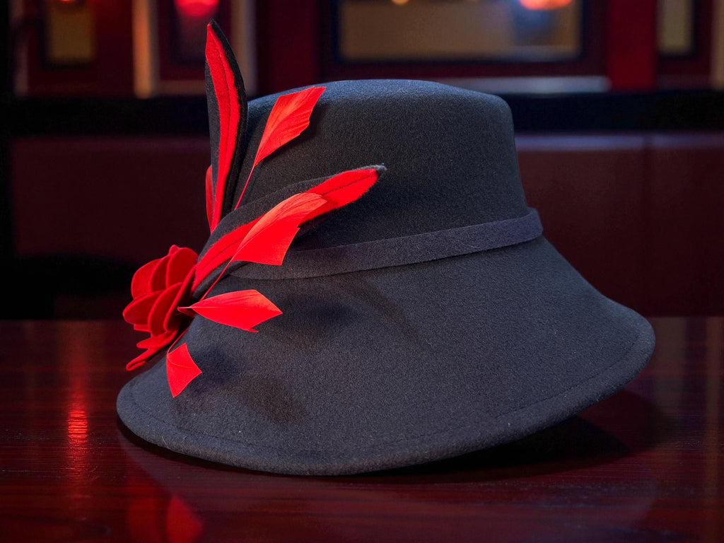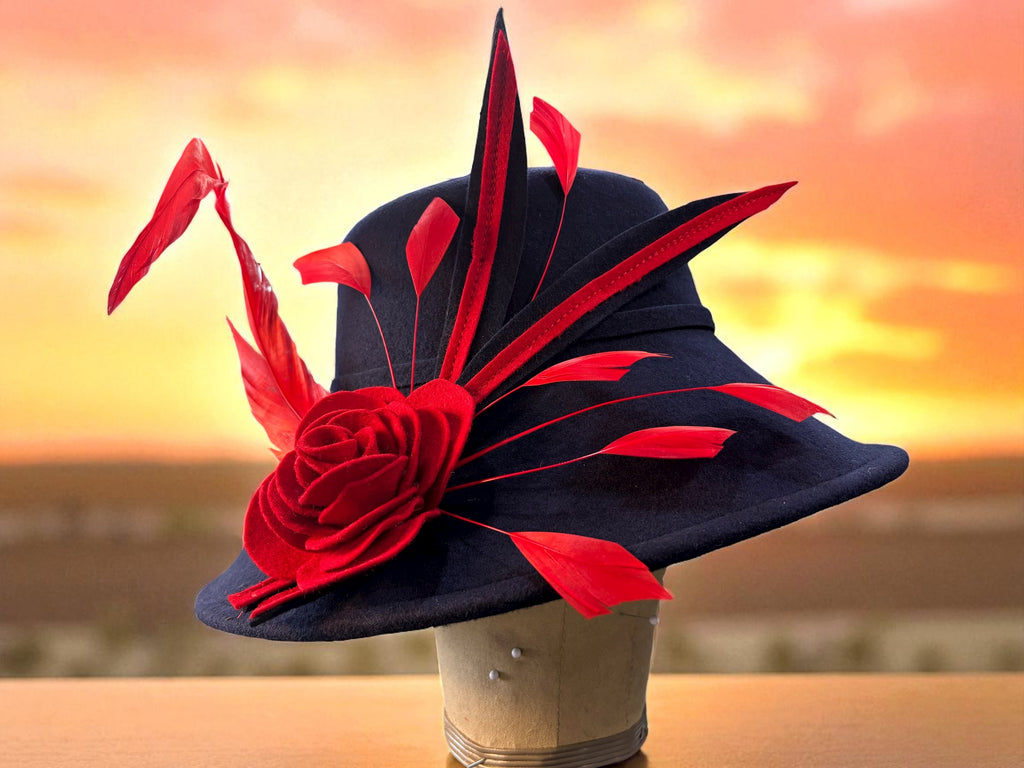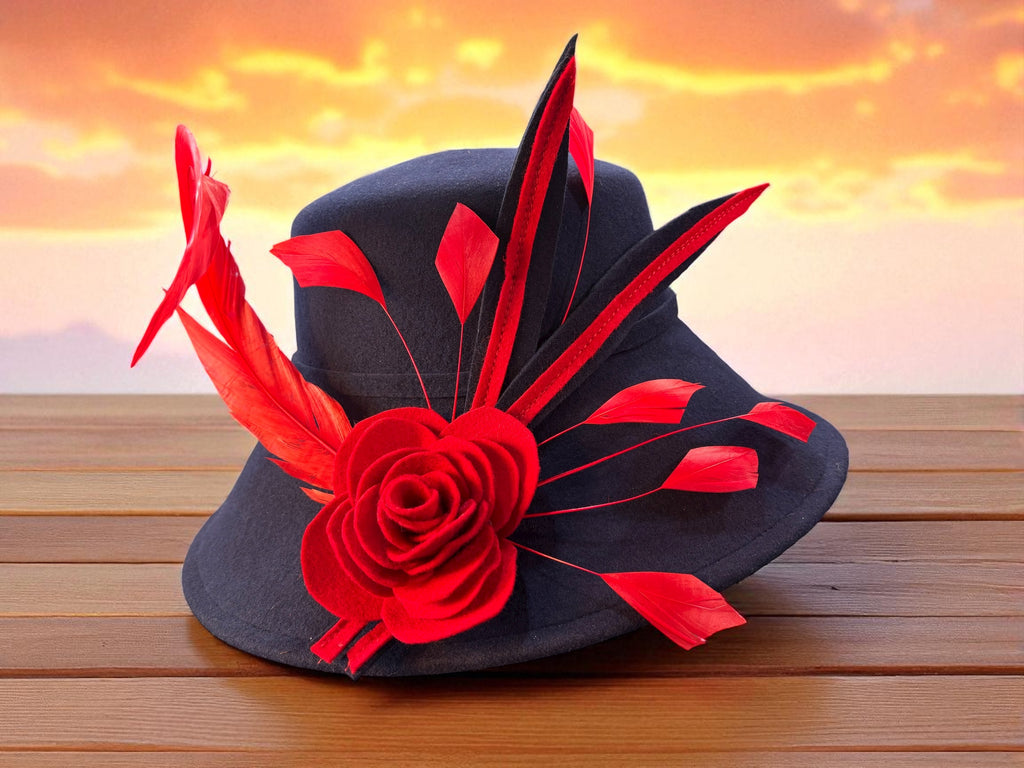 A fantastic new shape called the bucket in navy felt, trimmed with navy and red. Red feathers and a felt rise complete the lookin this cute little number .